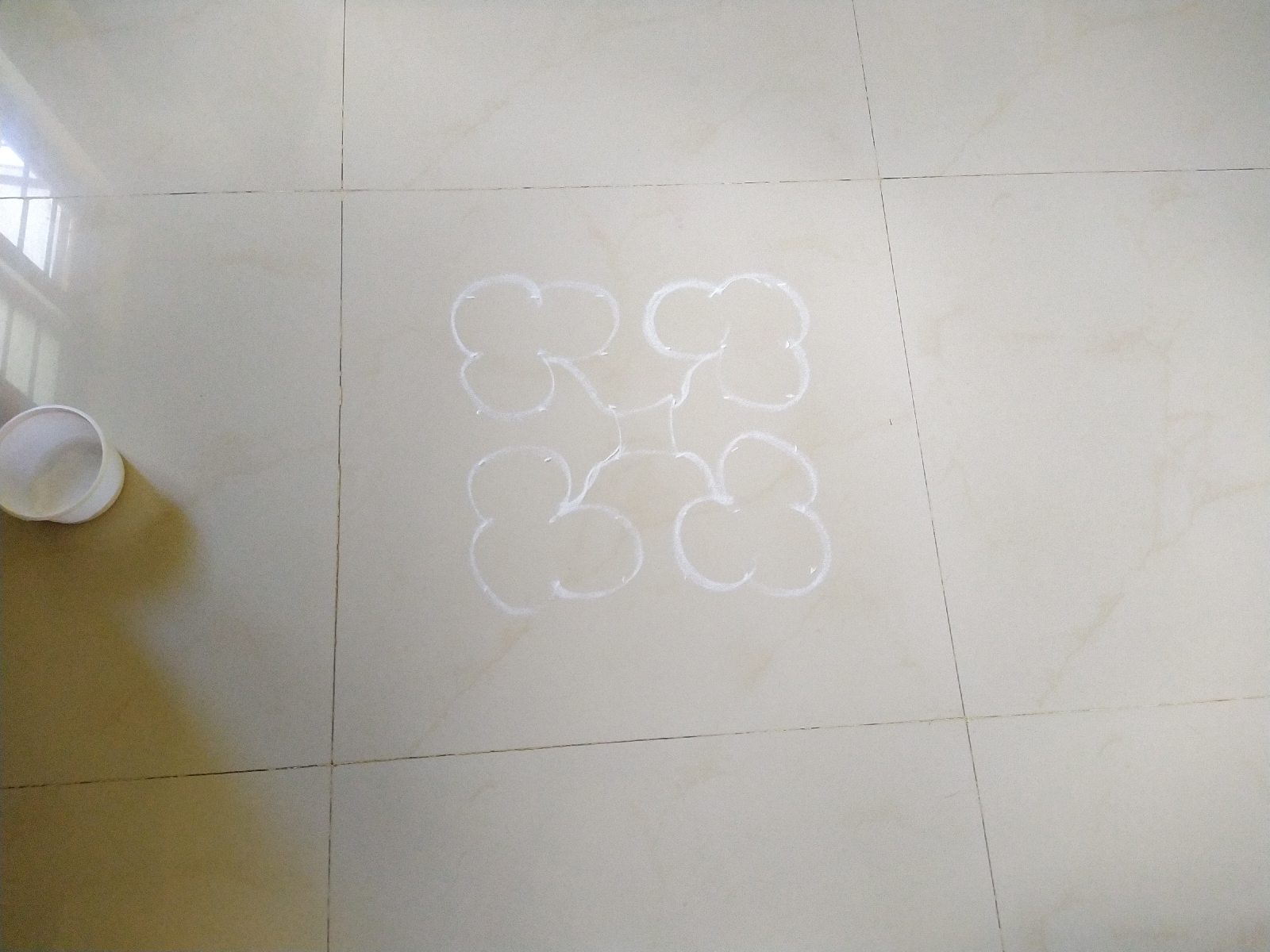 This Padi Kolam is drawn with wet rice flour and kaavi / Kempu powder.