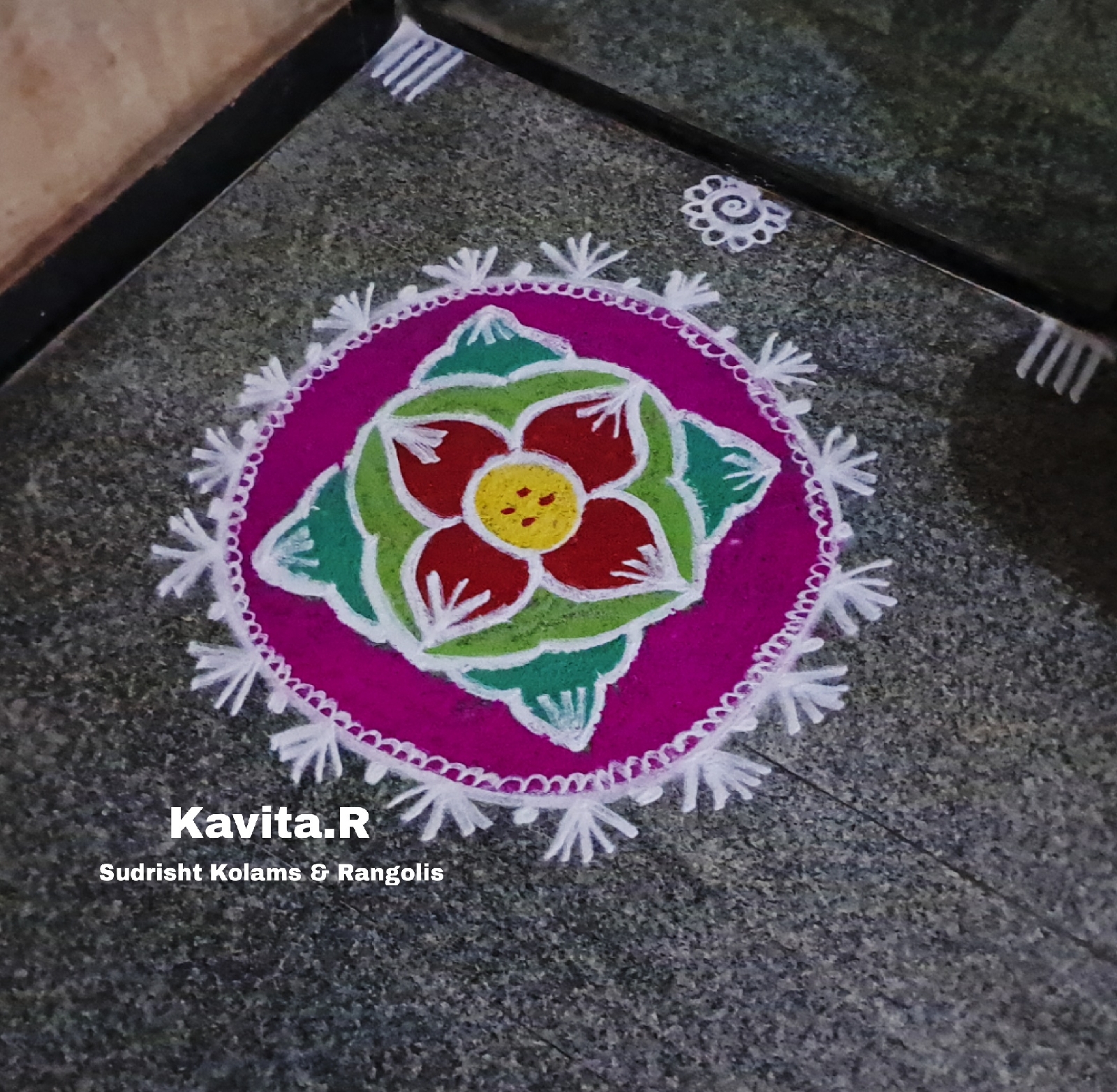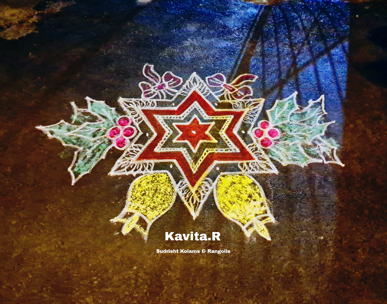 A wetriceflourkolam/ maakolam drawn with a star design at the center extended with lotus and bird design.
