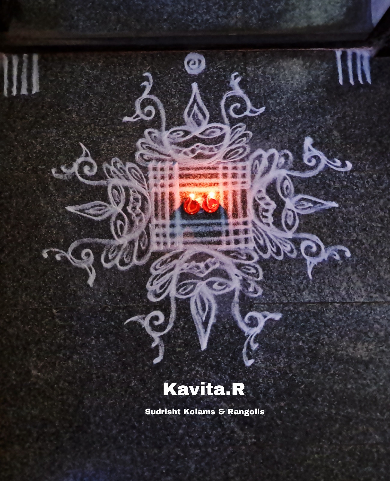 A traditional padikolam with a symmetry drawn with 4lines on all sides. Diya and peacock design inspired by Prathima Dattaatreya akka.